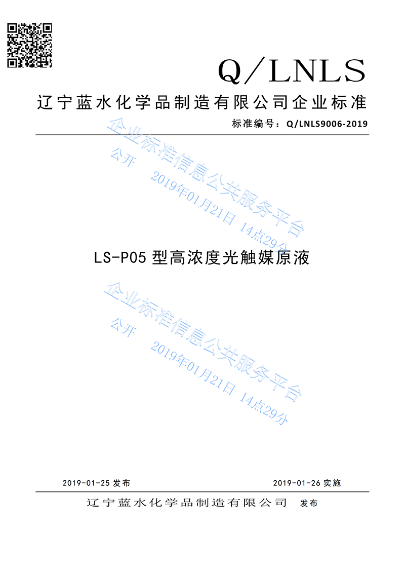 標準名稱:LS-P05型高濃度光觸媒原液標準編號:Q/LNLS9006-2019連接地址:附件:Q_LNLS9006-2019LS-P05型高濃度光觸媒原液最新.pdf公開時間:2019/1/21 14:29:22